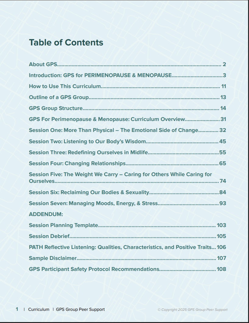 The GPS for Perimenopause & Menopause curriculum offers a structured, accessible, and evidence-informed approach to help participants make sense of these changes in community. Through reflective listening, mindfulness, guided dialogue, and psychosocial education, facilitators can create safe spaces where people share openly, reduce isolation, and reconnect with their inner wisdom. At its core, this curriculum honors the power of being heard. It helps participants realize there is nothing wrong with them, that their experiences are real, and that they are not alone.
